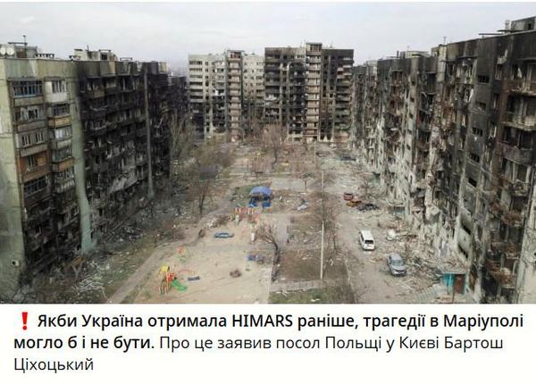 Ірина Фаріон цитує сказане послом Польщі у Києві Бартошем Ціхоцьким, про те, що, якби Україна отримала HIMARS раніше, трагедії в Маріуполі могло б і не бути. «Ми чудово розуміємо, що, якби HIMARS дійшов до України раніше, маріупольської трагедії могло і не трапитися. Українці просто стояли за 100 кілометрів від цього міста, їх розділяла рівнинна місцевість, вони не могли зсунути лінію фронту і були змушені бездіяльно спостерігати за трагедією своїх товаришів», — сказав посол. Додавши, що перемога України — це питання часу, масштабних руйнувань і жертв. Отож, світу потрібно рухатись, аби таких трагедій не було більше і не лише в Україні, а й в Європі.