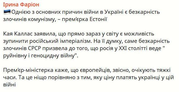 Ірина Фаріон цитує тодішню прем'єрку Естонії Каю Каллас. Яка заявила: «Однією з основних причин війни в Україні є безкарність злочинів комунізму… Прямо зараз у світу є можливість зупинити російський імперіалізм». На її думку, саме безкарність злочинів СРСР призвела до того, що росія у XXI столітті веде " руйнівну і геноцидну війну".