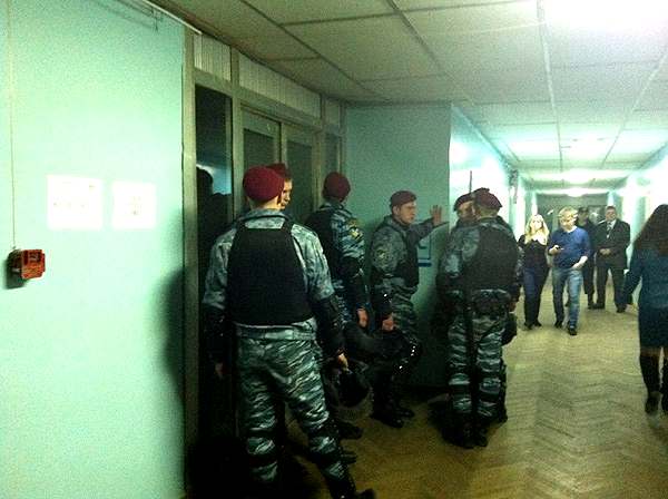 Чтобы попасть в суд настоящим журналистам приходится заходить через «черный ход» и подниматься пешком по лестнице на 10 этаж. Подняться на лифте невозможно, его отключили. Коридор, ведущий в помещение суда, занят примерно 30 молодыми людьми, никого туда не пускают.