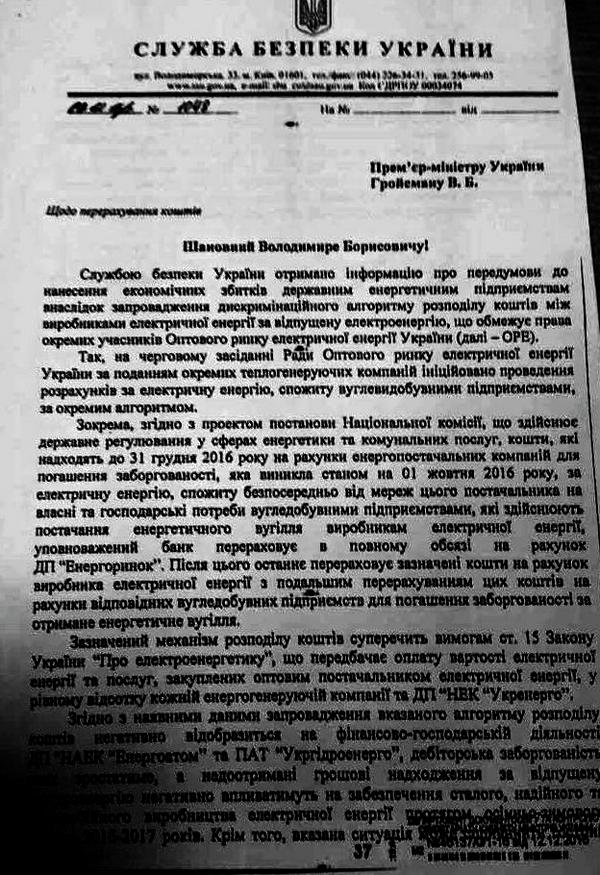 В распоряжении «Наших грошей» есть письмо на имя премьер-министра от председателя СБУ. Василий Грицак накануне принятия решений НКРЭКП, Минэнерго и «Энергорынка» предупреждал Владимира Гройсмана, что игнорирование законного алгоритма распределения денег между энергетиками негативно отразится на «Энергоатоме» и «Укргидроэнерго». А потому «с целью локализации угроз энергетической безопасности государства, устранения причин и условий, дестабилизирующих социально-политическую обстановку, считается целесообразным безотлагательно рассмотреть вопрос по недопущению реализации предложенного Советом ОРЭ механизма распределения средств между производителями электрической энергии за отпущенную электроэнергию».