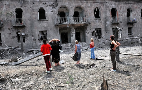 Грузины возле здания, пострадавшего от российских бомбардировок в Гори в 2008 году. Фото: Dimitar Dilkoff / Agence France-Presse - Getty Images