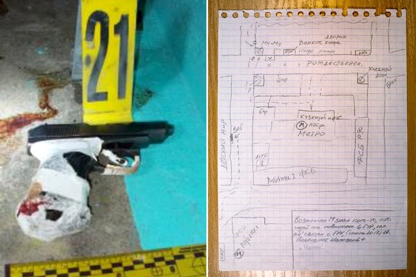 Слева оружие, использованное при убийстве, которое осталось на месте преступления.Справа карта центральной части Москвы, которую Смородинов нарисовал по памяти. Она включает в себя кафе, где, по его словам, он часто встречал своих российских наставников. Фото: Джозеф Сувенски для Нью-Йорк Таймс