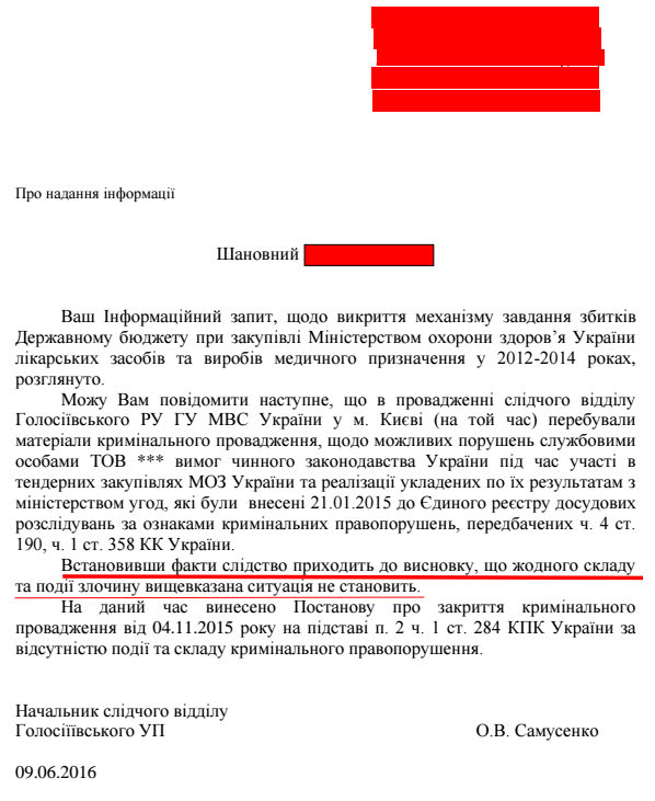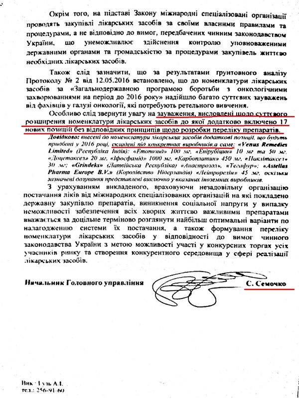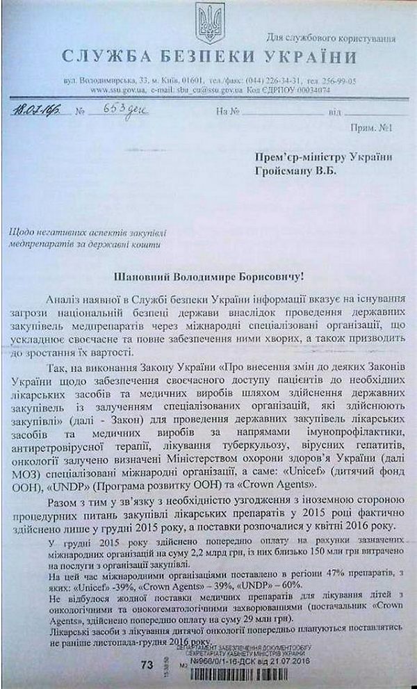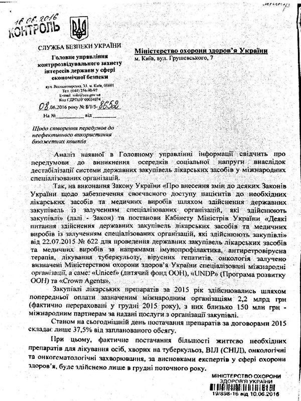 Кроме этого, контрразведывательное управление по вопросам защиты интересов государства в экономике Главка «Е» СБУ под руководством Сергея Семочко писало в Минздрав, что считает «угрожающим» расширение перечня лекарств, закупаемых международными организациями.