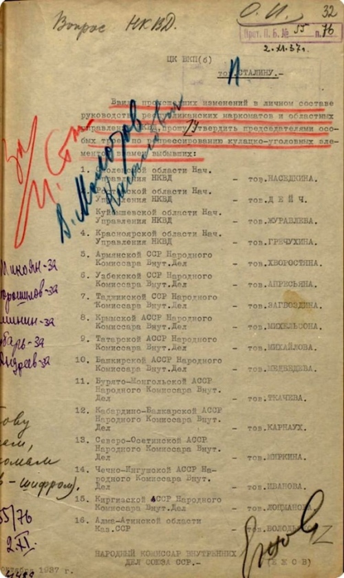 2 ноября 1937 года Политбюро утверждает список председателей «троек» из 16 человек [«тройки» - внесудебные органы репрессий в СССР во время Большого террора. Состояли из функционера НКВД, секретаря обкома партии и прокурора - ИП].
