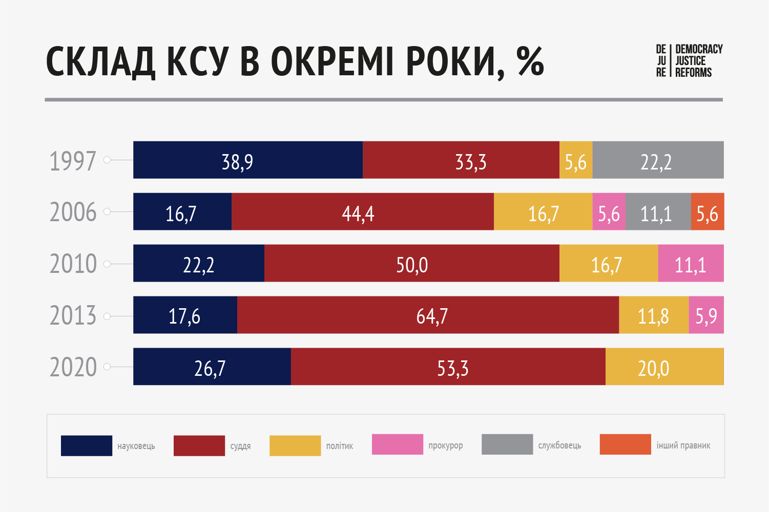 Якщо раніше президент та Верховна Рада не призначали суддів, натомість створювали пропорційне представництво іншим категоріям (науковцям, службовцям, політикам), то наразі і глава держави, і парламент до третини своєї квоти заповнюють суддями при тому, що з'їзд суддів призначає тільки суддів. Також з часом зросла частка колишніх політиків у КС.