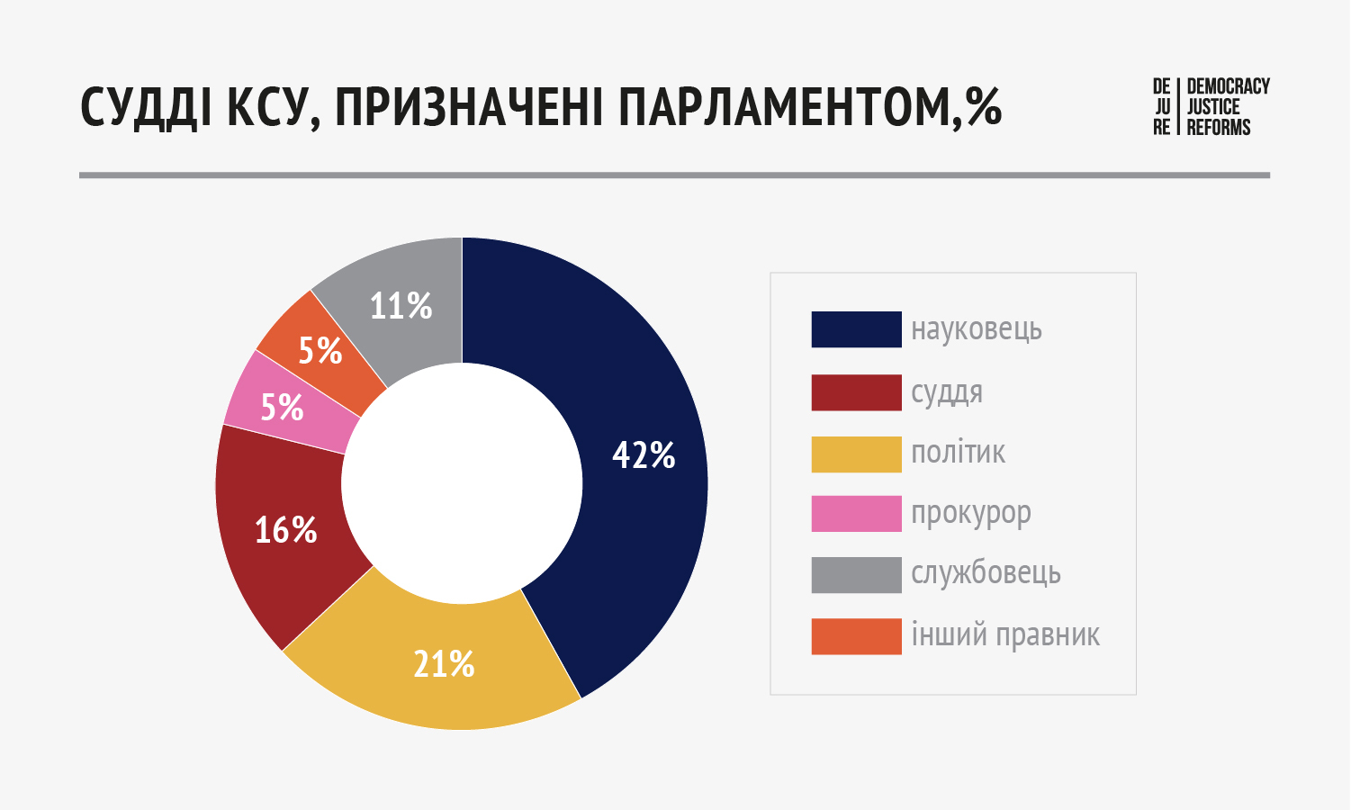 Навіть сьогодні у недоукомплектованому КС працюють більше половини суддів та колишніх суддів. Якщо раніше у формуванні КС існував паритет, коли президент та парламент призначали науковців, політиків, службовців чи інших правників, а з'їзд суддів – лише суддів, то тепер подібних принципів не дотримуються.