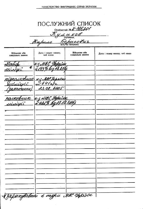 Письмо А.Зинченко осталось без ответа. Уже через три месяца — 20.05.2005г. К.Куликов приказом № 424 был назначен на искомую должность. Еще через три месяца приказом Ю.Луценко ему присвоено звание подполковника милиции. В приказе перечислены заслуги Кирилла Борисовича: «...осуществил большой объем работы, направленной на организацию взаимодействия органов внутренних дел Украины с правоохранительными органами зарубежных государств в борьбе с преступностью». Уже 27.07.2006г. приказом Ю.Луценко подполковнику Куликову присвоено звание полковника милиции (даже с большими заслугами перед Родиной офицеры, как правило, приходят путь от лейтенанта до полковника за