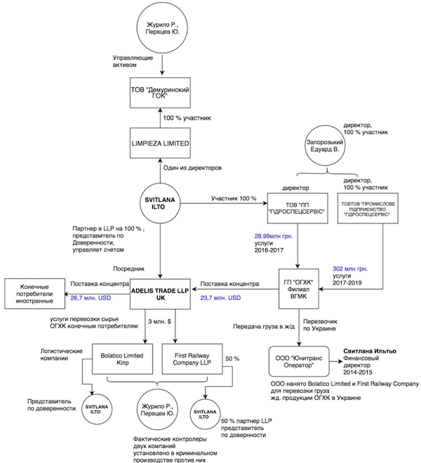 Компанії «Юнітранс Оператор», First Railway Company LLP і Bolatico Limited надавали послуги перевезення сировини ОГХК кінцевим споживачам у зазначеній схемі, а Adelis Trade LLP – була посередником між ОГХК і кінцевими покупцями сировини. З лютого 2015 року ТОВ «Юнітранс Оператор» став монополістом залізничних перевезень ОГХК, вигравши тендери тільки за один рік на загальну суму 425,97 млн. грн. За адресою реєстрації ТОВ «Юнітранс Оператор» до 2015 року знаходився офіс ДП ОГХК.