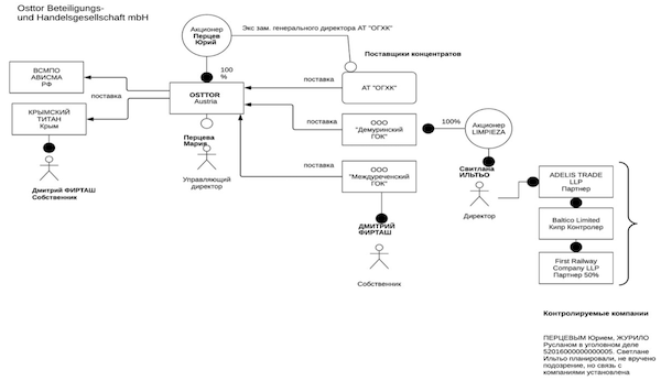 - Має прямі та опосередковані багаторічні зв’язки із громадянами України та РФ, які, у свою чергу, мають безпосереднє відношення до титанового бізнесу та постачань титанової сировини на підприємства ОПК Росії;