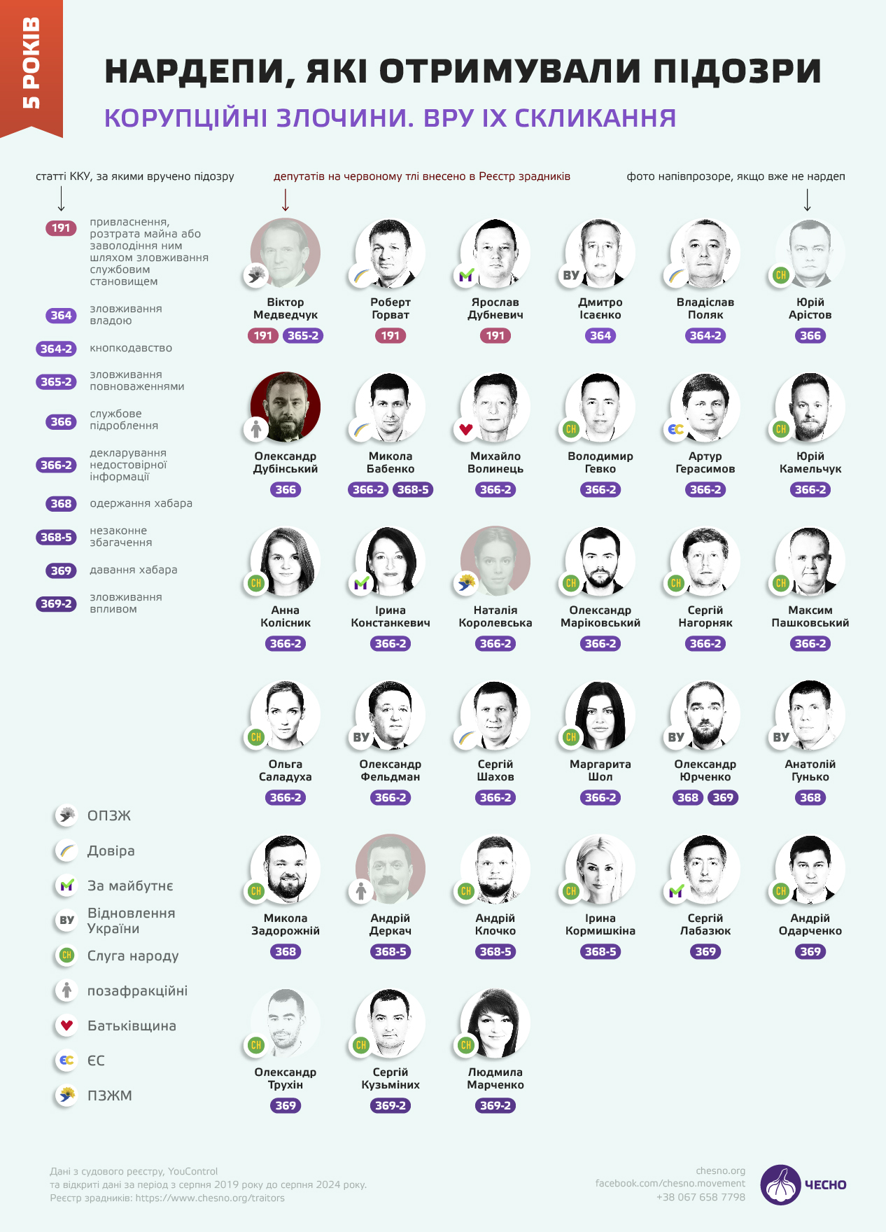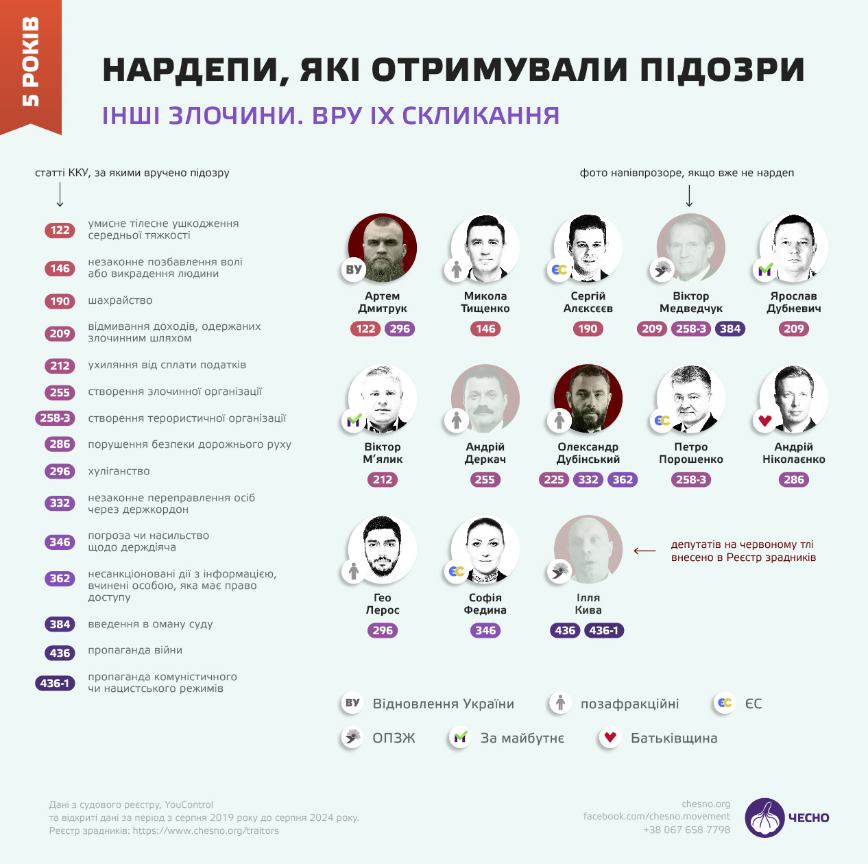 У публікаціях ЗМІ ЧЕСНО виявив 50 народних депутатів 9-го скликання, які отримали підозри в скоєнні кримінальних злочинів. Серед таких нардепів є представники усіх парламентських фракцій та груп, окрім “Голосу”. Найбільше підозр отримали депутати від “Слуги народу” та нині забороненої ОПЗЖ.
