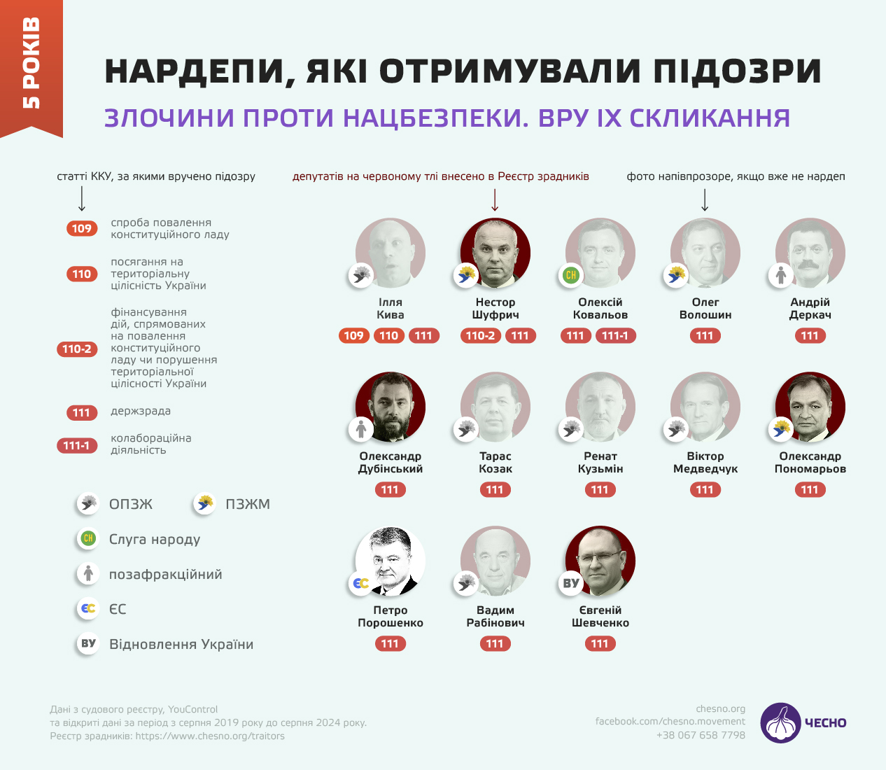 13 нардепів 9-го скликання мають підозри у злочинах проти нацбезпеки — найбільше серед них представників ОПЗЖ.