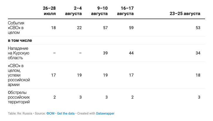 Опитування демонструють різкий сплеск уваги до військових новин та подій у Курській області, погіршення оцінок ситуації в РФ, зниження довіри владі та зростання тривожності. Проте атмосферу паніки першого тижня заходу ЗСУ в Курську область вдалося приглушити, у міру того, як потік нової інформації про події скорочувався. Водночас український контрнаступ завдав удару очікуванням російських перемог, що сформувалися на початку літа, що начебто могли наближати закінчення війни. У новий робочий рік громадська думка РФ вступає стривоженоюі чекає розвитку подій під Покровськом.