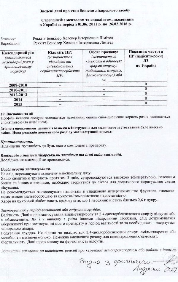 Руководитель ДЭЦ Ковтун подписала изготовленное заместителем директора Натальей Шолойко письмо, из которого следует, что за шесть лет с леденцами «Стрепсилс» в ДЭЦ поступила информация о десятке случаев предусмотренных побочных реакций (аллергия и т. д.), то есть тех, о которых предупреждают в инструкциях к таблеткам.