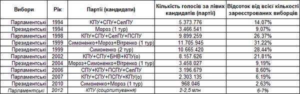 Интересна динамика коммунистического электората в годы независимости Украины (к левым отнесены КПУ, ПСПУ, СПУ, СелПУ, «клоновая» КПУ(о) и кандидаты от них):