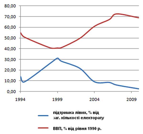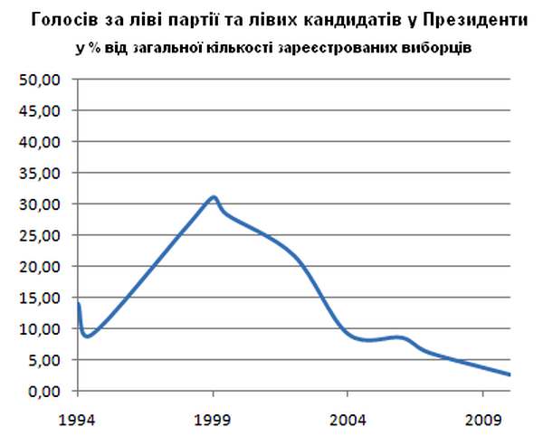 А вот интересный график — поддержки левых. Пик популярности левых —