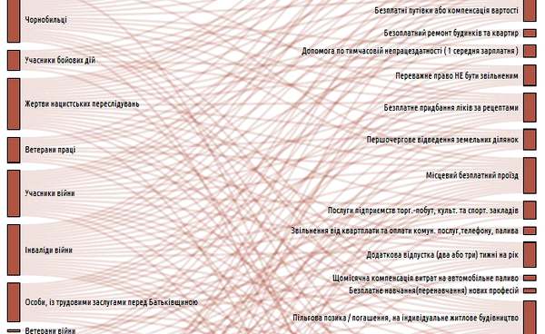 Один из бывших работников Минтруда и соцполитики, рассказал, что во время его работы в ведомстве на стене висела огромная схема, на которой были нарисованы все льготы. Когда парламент вносил какие-то изменения, работники дописывали на этой схеме новый квадратик. Подозреваем, что это единственный в стране более-менее полный перечень льгот.