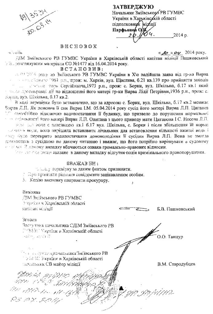 В ответ на заявление о происшествии из Змиевского райотдела милиции пришел даже не ответ — вывод за № 79/3534 от 20 апреля 2014 года. За подписью аж двух заместителей начальника райотдела и одного участкового. Мол, ничего криминального мы не усматриваем, просто соседи не сумели договориться. А потому, дорогие граждане, не отвлекайте нас по пустякам. Это гражданско-правовые отношение, идите в суд.