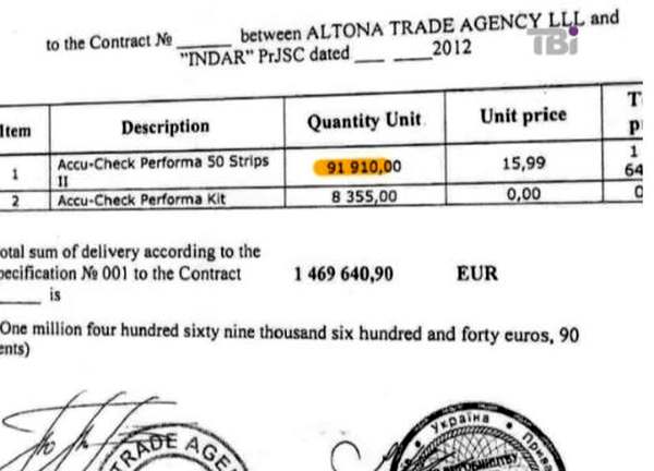 Во-вторых, мы получили копию контракта «Индара» на закупку за рубежом тестов-полосок для выполнения украинской тендера. Удивительно, но это договор не с немецким производителем «Рош Диагностикс», а с британской компанией «Altona Trade Agency LLP». Согласно контракту, «Индар» закупает 92 000 упаковок тестов — ровно столько, сколько запросит на тендере министерство. И платит за товар офшорной фирме 147 тыс евро — опять-таки, ровно столько, сколько, в конце концов, в гривнах «Индар» получит от министерства из украинского бюджета.