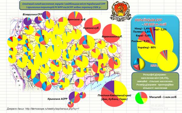 Этнический состав населения в округах и наиболее крупных городов Украинской ССР и прилегающих территорий РСФСР (России) и БССР (Беларуси) по состоянию на 1926 год: