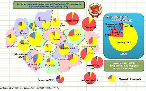 Этнический состав населения областей украинской ССР и прилегающих территорий РСФСР согласно переписи 1939 года: