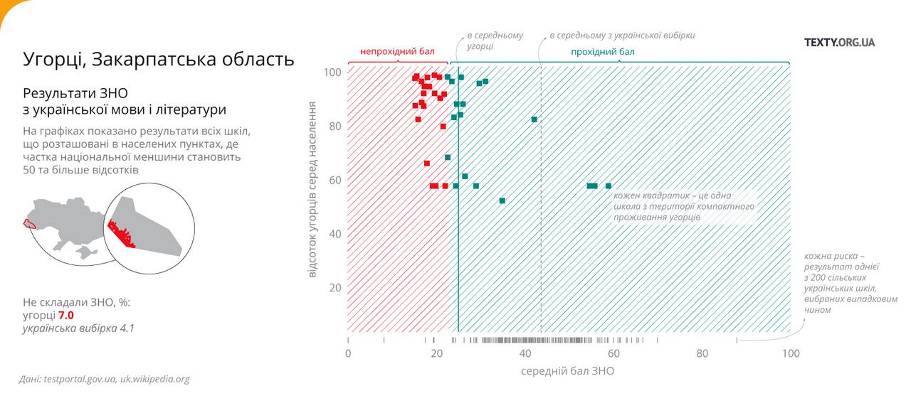 Угорці в Україні мають замкнений цикл освіти національною мовою — від дитячого садочка до Закарпатського угорського інституту імені Ференца Ракоці II, і це відбивається на загальному бажанні громади складати українське ЗНО.