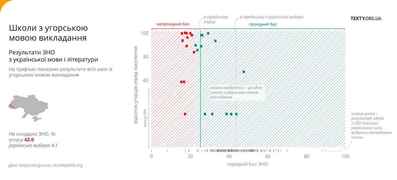 42% угорських дітей не складають цей тест взагалі, румуни йдуть на нього, але, як і угорці, мають погані результати. Болгари ж складають ЗНО на загальноукраїнському рівні.