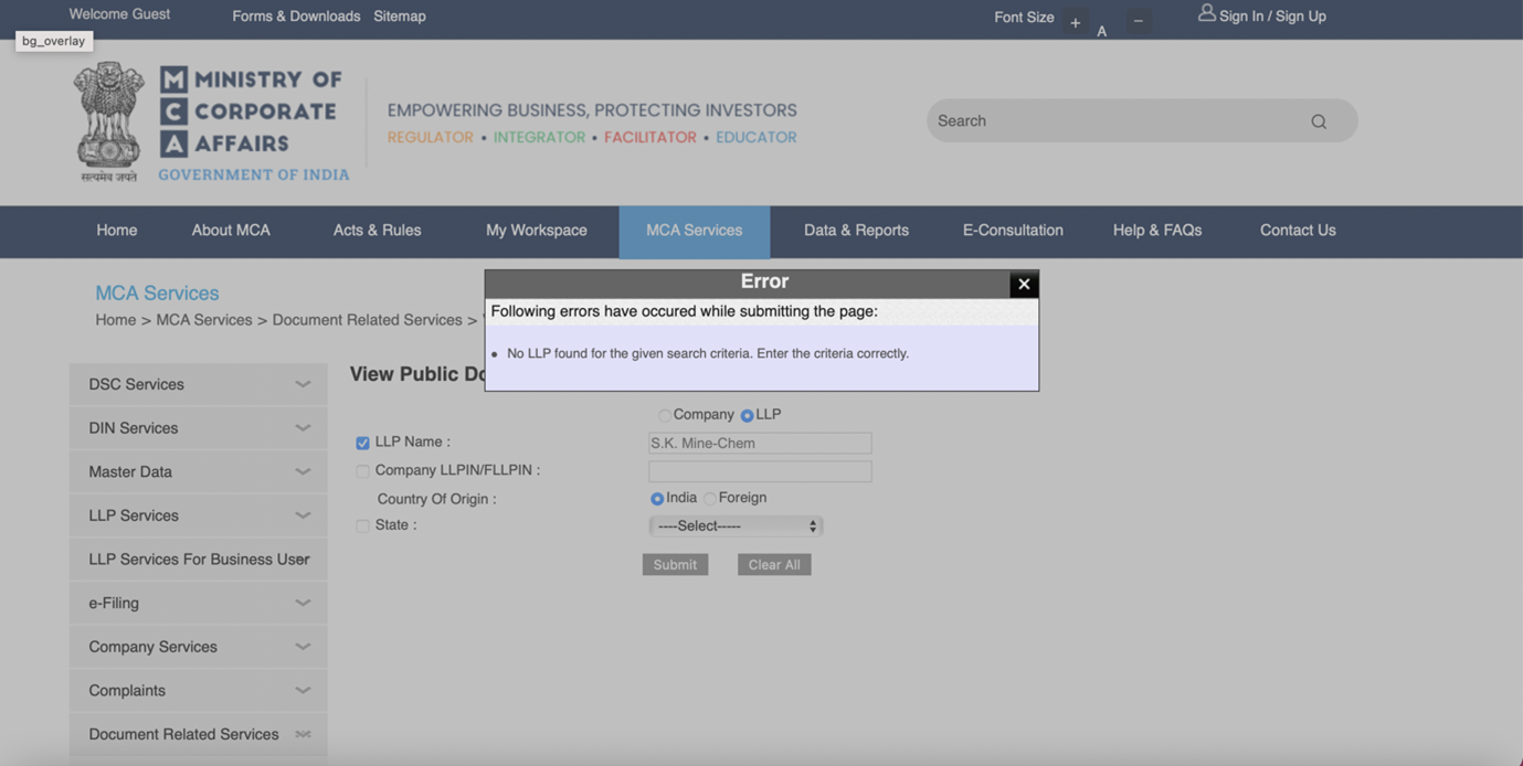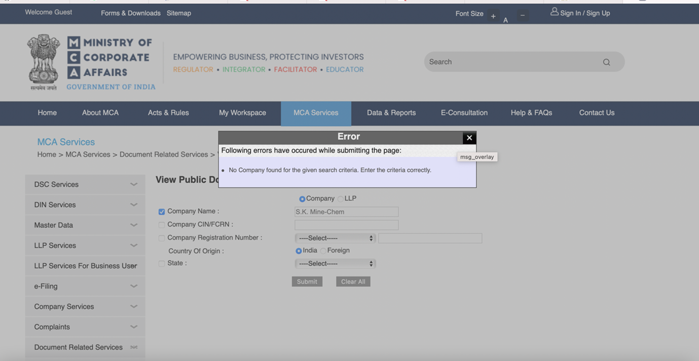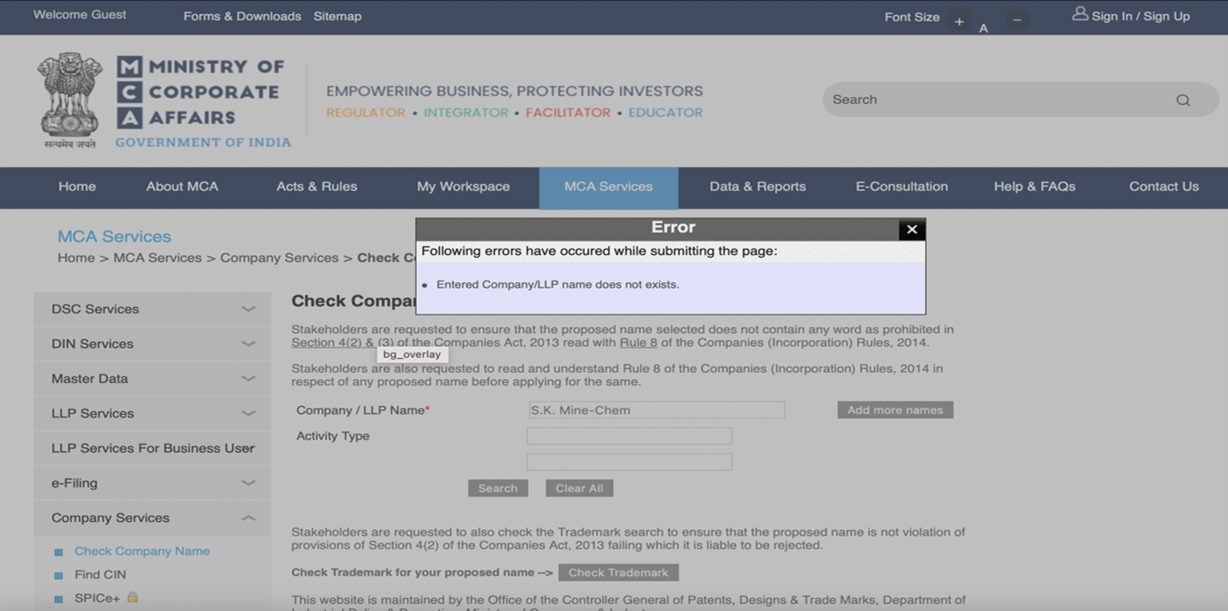 Результаты поиска компании S.K. Mine-Chem на официальном сайте Министерства корпоративных дел Индии