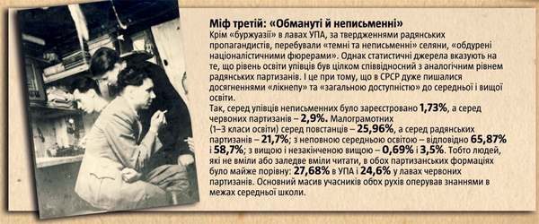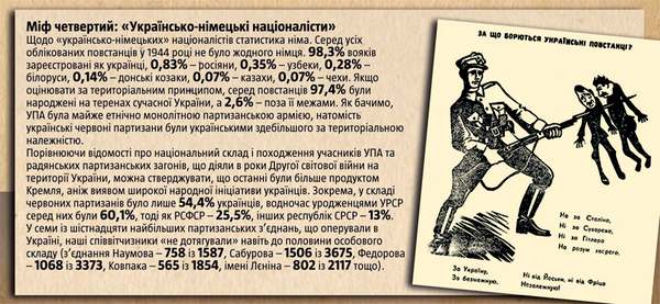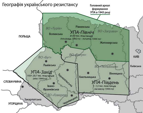 УПА была проявлением всеукраинского движения Сопротивления, которое не ограничивалось теми или иными регионами, а стремилось приобрести общенациональный масштаб. Участие многих выходцев из Приднепровской Украины в рядах УПА подтверждает также ту «горячую любовь», которую испытывали советские украинцы к большевистскому режиму после ужасов Голодомора, принудительной коллективизации, сталинских репрессий и позорного отступления Красной армии летом 1941 года. Недаром, по оценкам немцев, мобилизационный потенциал УПА достигал 100 тыс. человек, реально же в составе «лесной армии» на пике ее численности находилось до 35 тыс. человек.