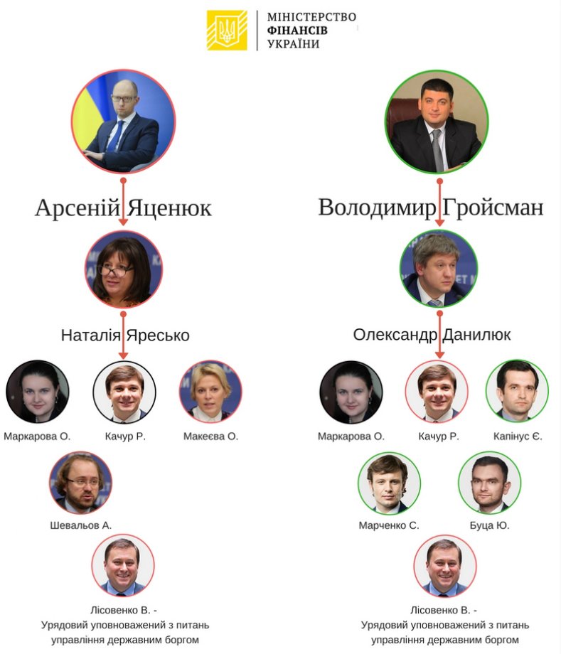 Как и в случае с Абромавичусом, Яресько привела на руководящие должности в министерство много новых людей из частного сектора. Ее заместителями стали: Оксана Маркарова (председатель правления, президент инвестгруппы ИТТ-Инвест), Елена Макеева (гендиректор в аудиторской компании "Аксенова и партнеры"), Артем Шевалев (представитель Украины в ЕБРР), Роман Качур (пришел в Минфин с Минэкономики) .