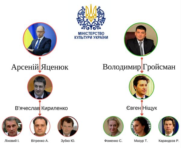 После перехода Вячеслава Кириленко с должности министра культуры на позицию вице-премьера его место занял Евгений Нищук , возглавлявший это ведомство после Майдана 2004 года. С приходом нового руководителя все высшее руководство претерпело изменения: первым заместителем сталаСветлана Фоменко , другие заместители - Тамара Мазур и Ростислав Карандеев вместо Игоря Лихового, Андрея Витренко и Юрия Зубко. Согласно исследованию эффективности работы правительства за 2015 год, министерство заняло 10-е место . В Министерстве культуры с 19 департаментов по назначению НИЩУК изменились руководители трех: отдел обеспечения работы министра (патронажная служба министра), отдел управления персоналом (отдел кадровой работы и государственной службы) и управление охраны недвижимого культурного наследия и заповедников.