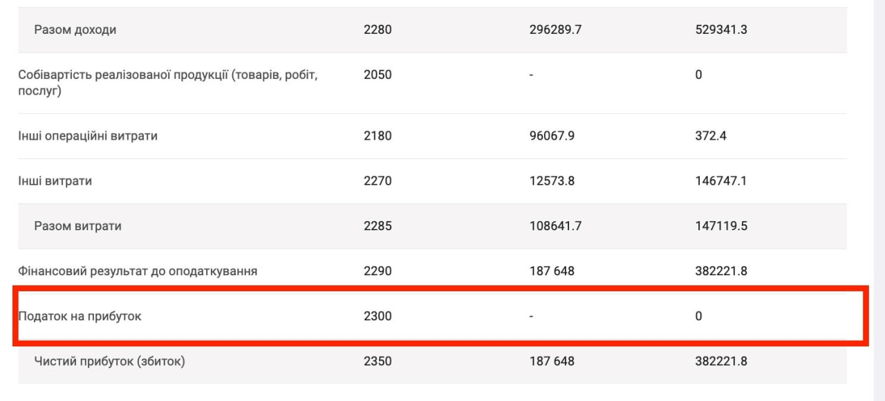 За даними аналітичної системи YouControl, «Соньєра Інвест» є прибутковим товариством. 2022 року фірма задекларувала 328 млн грн до оподаткування. Проте у фінансовій звітності щодо податку на прибуток вказано лише нулі та прочерки замість десятків мільйонів гривень, які більше пасують фірмі з доходом у третину мільярда (див. рис. 1).