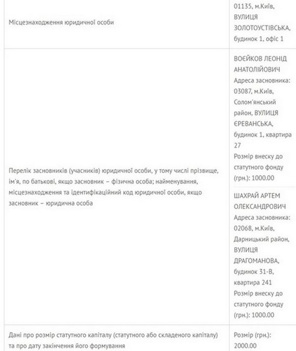 Учредили фирму в октябре 2014-го два жителя Киева — Леонид Воейков и Артем Шахрай, каждый из которых вложил в установной фонд по тысяче гривен (см. фото).