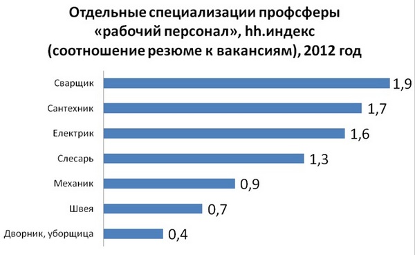 Самая высокая конкуренция на рынке труда в этой профсфере среди сварщиков, сантехников, электриков и слесарей. Что интересно, работодателям не хватает не механиков и швей, а дворников и уборщиц. hh.индекс для этих профессий составляет лишь 0,4, т.е. на 1 квалифицированного работника — 2,5 вакансии.