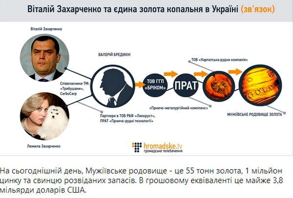 13 января украинские СМИ распространили информацию о том, что министр внутренних дел Виталий Захарченко — крупнейший... золотодобытчик Украины. А запасы золоторудного месторождения, якобы принадлежащего министру через «дружественные» компании, оцениваются в $1,5 миллиарда.