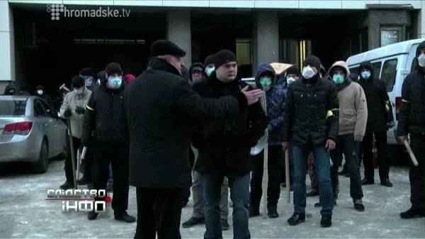 Подходы к зданию окружила милиция, за которой прятались люди в масках. В руках они держали шесты от лопат.