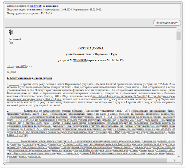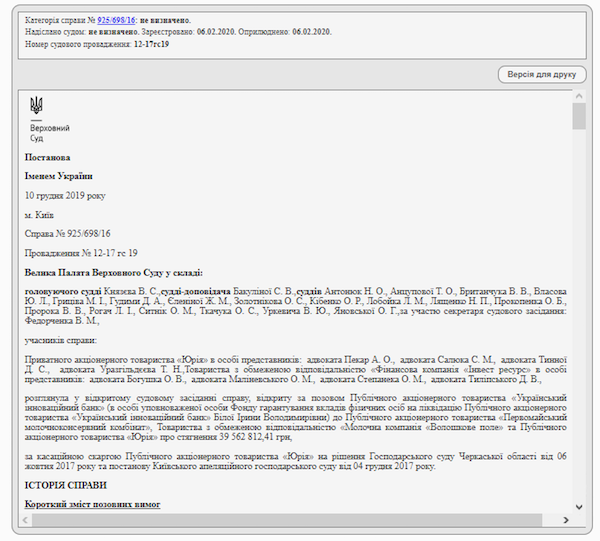 10 грудня 2019 р. Велика Палата Верховного Суду прийняла постанову, в якій рішення Господарського суду Черкаської області від 6 жовтня 2017. та постанову Київського апеляційного господарського суду від 4 грудня 2017 р. скасувала, а справу направила на новий розгляд до суду першої інстанції.