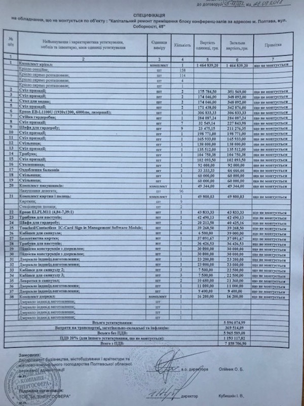 Первоначально было заявлено, что “покращення” сессионного зала обойдется в 15 млн грн. Но уже на начало 2019 года смета раздулась почти до 40 млн грн. - и это в воюющей стране, военное руководство которой постоянно сетует на нехватку средств на реформу ВСУ.
