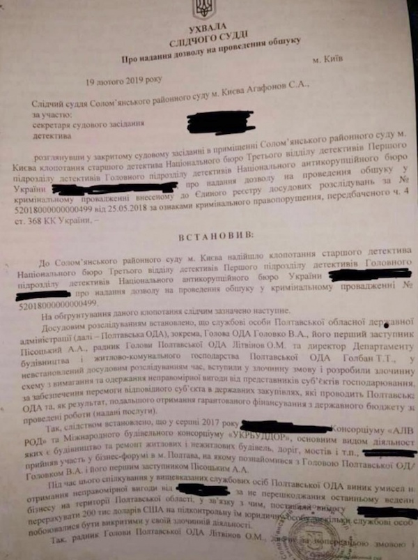 Детективы Национального антикоррупционного бюро установили, что руководители Полтавской облгосадминистрации создали преступную схему вымогательства взяток от предпринимателей за обеспечение их победы в государственных закупках, которые проводит обладминистрация. И систематически вымогали от предпринимателей миллионные “откаты” и взятки в сотни тысяч долларов, элитных машин и дорогих гаджетов (подробности). Во время обысков были изъяты ценности и вещдоки, подтверждающие вину подозреваемых. Об аппетитах чиновников красноречиво говорит такой вот факт: в качестве одной из взяток В. Головко потребовал и получил элитный внедорожник Mercedes-Benz AMG G 63. Или такой: только крыша особняка Головко элитной в Конча-Заспе под Киевом, укрытая натуральным камнем-сланцем, стоит более S1 млн.