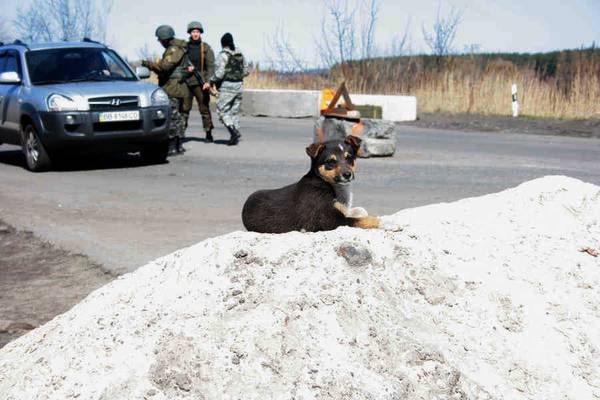 Пока люди суетятся, верный друг блок-поста греется на песке.