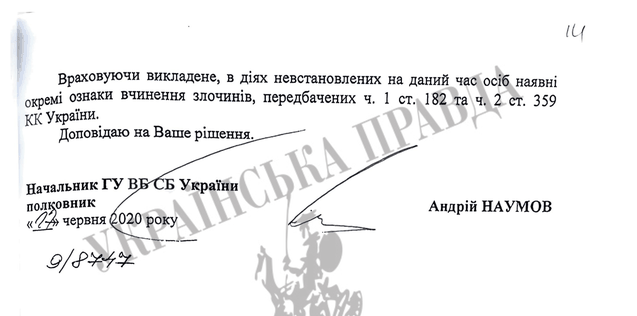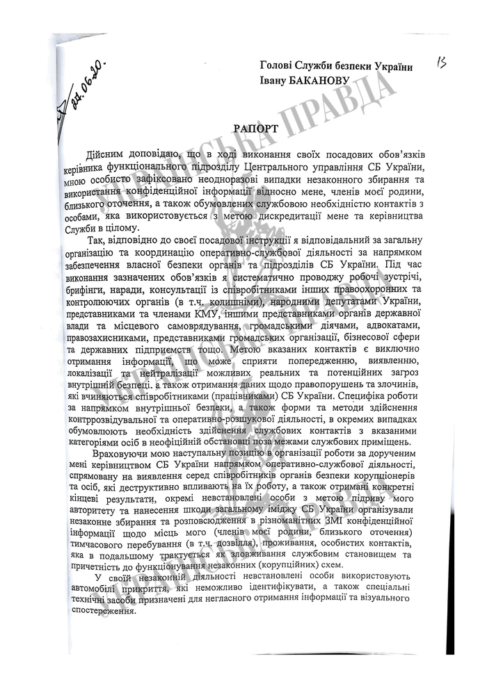 "Мною лично зафиксированы неоднократные случаи незаконного сбора и использования конфиденциальной информации ... которая используется для дискредитации меня и руководства службы в целом", - писал летом Наумов в рапорте на имя председателя СБУ Ивана Баканова.