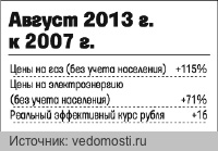 Возросшие издержки ведения предпринимательской деятельности (цены на продукцию и услуги инфраструктурных монополий, заработная плата, процентные ставки) делают невыгодным продолжение производства на значительной части старых мощностей, а также реализацию серьезных инвестиционных проектов. (см. таблицу «Август 2013 г. к 2007 г.»)