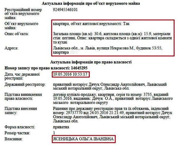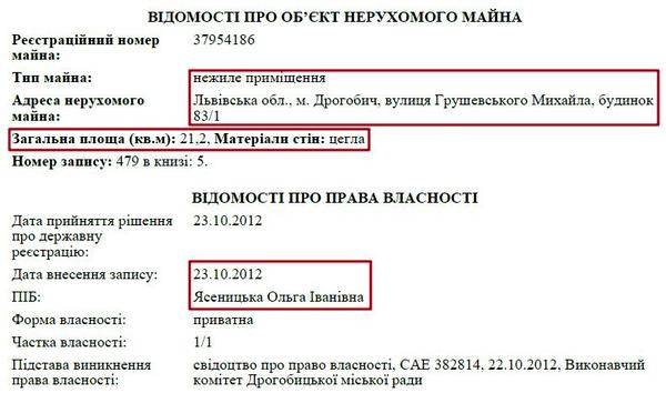 Окрім цього житла, Ольга Іванівна Ясеницька є власником квартири у Львові за адресою: вул. Некрасова, 53/55. Також пані Ольга володіє будинком площею 219 кв. м. у Дрогобичі та двома нежитловими приміщеннями.