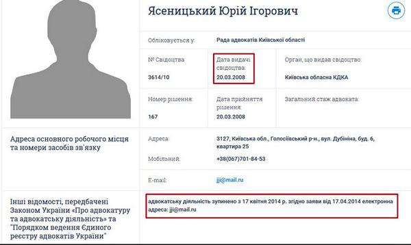 Також відомо, що в період 2008–2014 років Юрій Ясеницький був зареєстрований адвокатом. На жаль, інформації про те, чи працював протягом цього часу Юрій Ігорович прокурором, немає. Тому сподіваємося, що це з’ясують відповідні правоохоронні органи, адже поєднання посад прокурорами є порушенням законодавства. Також завдяки системі YouConrol ми дізналися, що протягом 2009–2014 років прокурор був керівником «АДВОКАТСЬКА ГРУПА «ПРЕЦЕДЕНТ» та два роки був зареєстрованим фізичною особою-підприємцем.