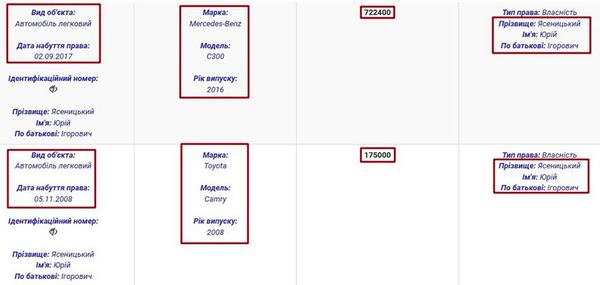 Якщо говорити про рухоме майно подружжя, то в декларації вказано, що Юрій Ігорович із 2017 року є власником Mercedes-Benz C300 2016. Задекларована вартість цього авто – 722 тис. грн. Окрім того, Юрій Ясеницький володіє Toyota Camry 2008 вартістю 175 тис. грн (станом на 2008 рік).