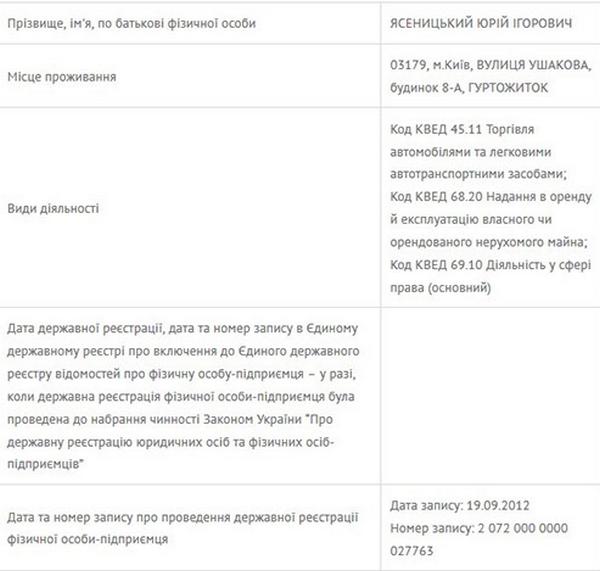 Ми також вирішили дізнатися, ким працюють батьки Юрія та Юлії Ясеницьких. Матір пані Юлії – Світлана Іванівна Яхно – зареєстрована фізичною особою-підприємцем і займається торгівлею текстильними товарами. До речі, Світлана Іванівна також значиться власником новенького авто – Audi Q7 2017 року. Подібний автомобіль сьогодні коштує бл. 70 тис. дол. Батько пані Юлії теж займається бізнесом – є ФОП-ом і власником ПП «Іскра».