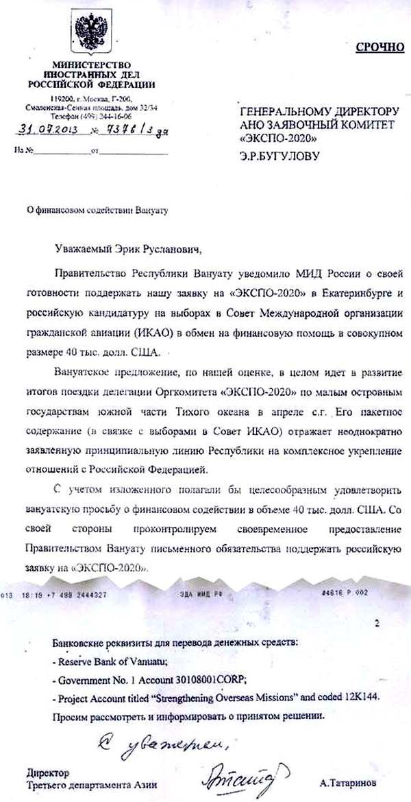 Например, как следует из письма директора третьего департамента Азии МИД РФ А. Татаринова, адресованного гендиректору заявочного комитета «ЭКСПО-2020» Э. Бугулову, Министерство иностранных дел России полагает целесообразным удовлетворить просьбу Республики Вануату о финансовом содействии в объеме 40 тысяч долларов США. В обмен на эти «бусы» Республика Вануату готова поддержать заявку России на проведение «ЭКСПО-2020» в Екатеринбурге. Указаны и банковские реквизиты для перевода денежных средств на счет с характерным названием «Укрепление заокеанских миссий».