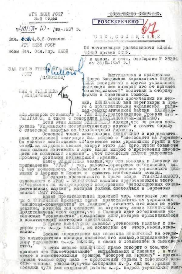 «Після перемоги Радянської влади на Україні, – йдеться в одному з документів, – Винниченко наприкінці 1919 року емігрував за кордон, де продовжує активну політичну діяльність. Від імені лівих соціалістів за кордоном він намагався вести переговори з радянським урядом про визнання ним так зв. «Української радянської самостійності» (ГДА СЗР України. – Ф. 1. Спр. 6760. – Т. 1. – Арк. 183).