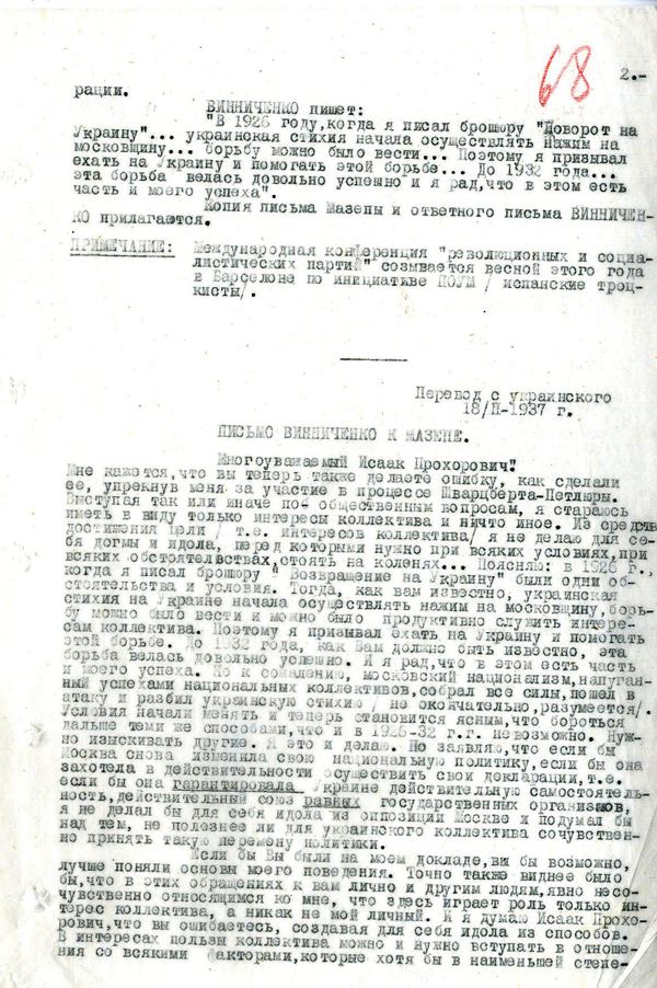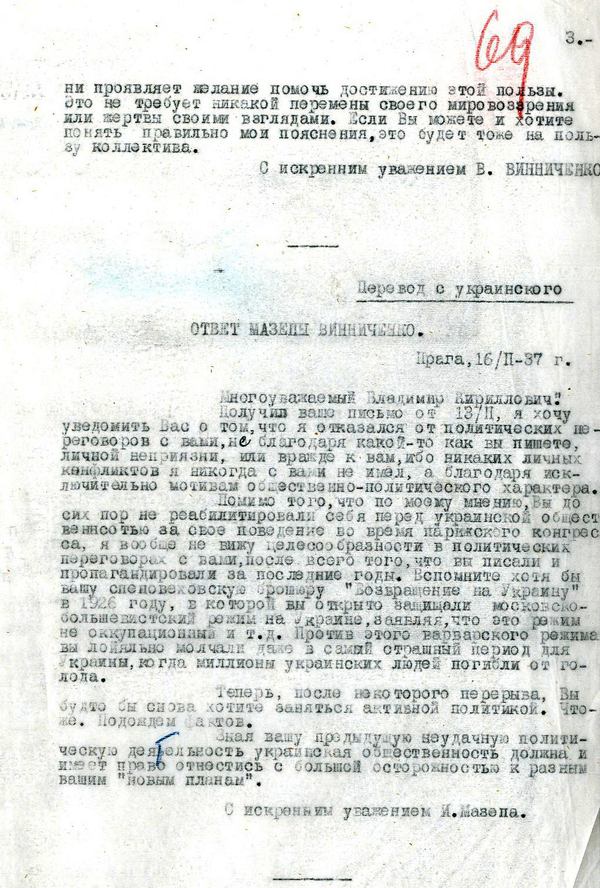 Ви приятелюєте з відомим емігрантом В. Винниченком. Про стосунки з ним у Лаванду, Марселі й тепер у Парижі відомо радвладі. Поки не пізно, я хочу порадити Вам негайно припинити контакти з Винниченком, звичайно, якщо Ви дійсно зацікавлені в поверненні до Радянського Союзу. І чим швидше припиниться це приятелювання, тим краще буде для здійснення Вашого задуму. Про цього листа нікому не розповідайте, окрім дружини. Ваш щирий доброзичливець».