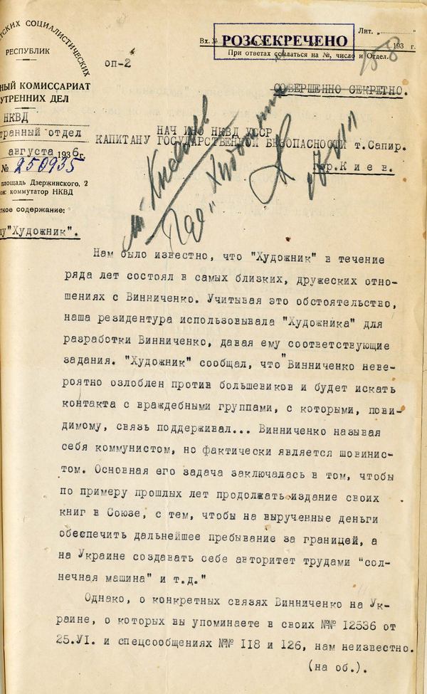 «Нам було відомо, що «Художник» протягом низки років був у доволі близьких, дружніх стосунках з Винниченком. Враховуючи цю обставину, наша резидентура використовувала «Художника» для розробки Винниченка, даючи йому відповідні завдання. «Художник» повідомляв, що Винниченко неймовірно озлоблений проти більшовиків і шукатиме контактів з ворожими групами, з якими, вочевидь, зв'язок підтримував… Винниченко називав себе комуністом, але фактично був шовіністом. Основні його наміри полягали в тому, щоб за прикладом минулих років продовжувати видавати свої книги в союзі і на отримані кошти забезпечувати подальше перебування за кордоном, а на Україні створювати собі авторитет працями «Сонячна машина» та ін. Однак про конкретні зв’язки Винниченка на Україні, про які ви згадуєте, нам невідомо» (ГДА СЗР України. – Ф. 1. Спр. 1942. – Арк. 158).
