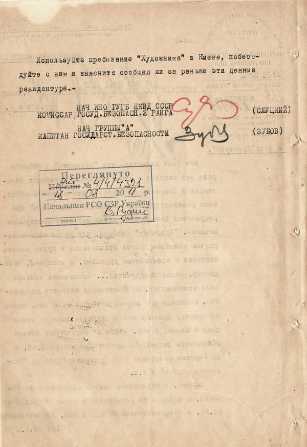 «З Винниченком у нього були дружні стосунки і він часто бував у нього вдома, коли той жив у Берліні. Деталізуючи питання про його взаємовідносини з Винниченком, з’ясував, що «Художник» завдяки роботі над ним Винниченка усвідомив себе українцем. Оскільки питання про близькі стосунки «Художника» з Винниченком раніше у його матеріалах не мали відображення, я продовжив з’ясовувати роль Винниченка в укр. еміграції і його орг. зв’язки з Україною. «Художник» мені заявив таке: «Коли я вже переїхав у 1925 р. до Парижа, Винниченко вже там жив, я загалом до від’їзду в Союз проживав у нього в квартирі тричі. Мав доступ до віх ділових паперів і був обізнаний у його листуванні. Винниченко мені неодноразово говорив, що на Україні має групу своїх людей, які ведуть певну (к.-р. – моя примітка) роботу і через підставну адресу в Парижі він, Винниченко, з ними зв’язаний (адреса у «Художника» десь записана, обіцяв її нам дати)» (ГДА СЗР України. – Ф. 1. Спр. 6760. – Т. 1. – Арк. 37).
